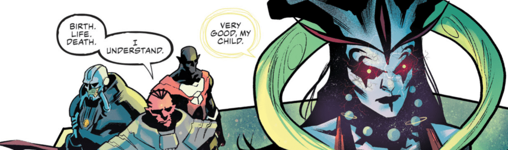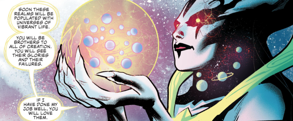 She then birthed three sons and gave each one a realm. Alpheus would rule the dark realm as a “World Forger” and use Element X (the purest form of creation itself) to populate “all that is and will ever be.” Mar Novu would rule the positive realm, monitoring the universes that Alpheus sent into his Orrery of Worlds. He would see to their development and prevent any crises that might rise among them. Mobius, Mar Novu’s opposite, would rule the antimatter realm, separating his mother’s multiverse from the Overvoid and the rest of the Omniverse, and keeping the boundaries free of life.