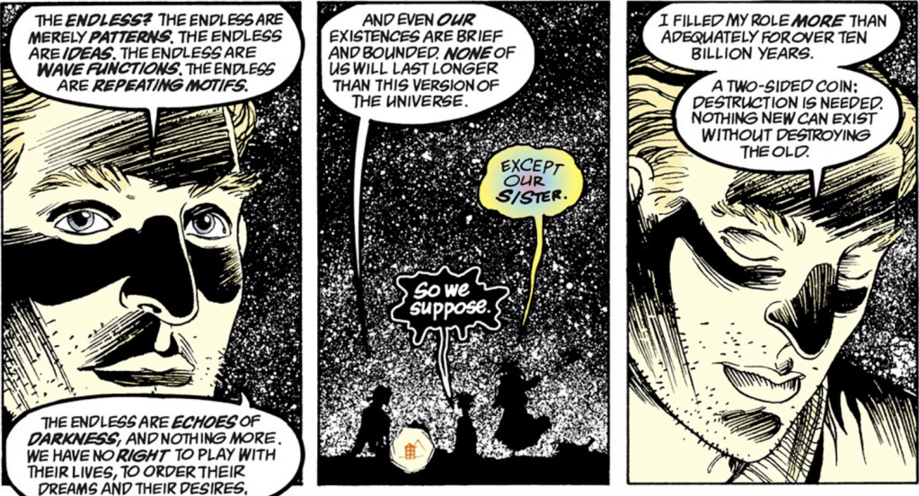 It’s been suggested that the Endless have parents: Time, the personification of time itself, and Night, the personification of the endless darkness that existed before the Omniverse was born. However, this may be true only in an abstract sense.