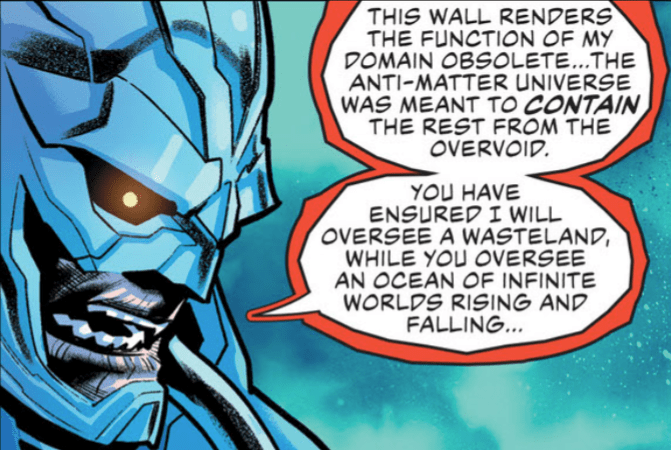 Mobius continued to blame Mar Novu for making his antimatter realm obsolete, since the Source Wall was now the boundary between the Multiverse and the rest of the Omniverse. He promised to eventually destroy the Orrery of Worlds.
