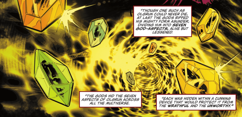 If the god-aspects of Olgrun are found and joined by one who is worthy, he will be reborn as the hero he was meant to be. But if they are found by one who is unworthy… mighty Olgrun will return in all his wrath and fury, and will return creation to the darkness from which it was born.