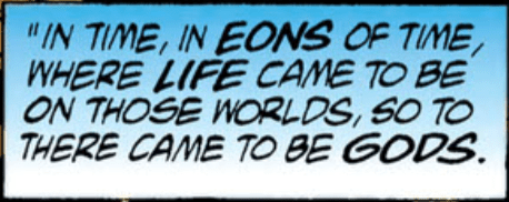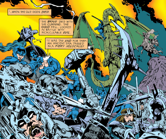 The remaining Old Gods came to believe the Source was a threat. Eight billion years ago, their leaders conspired to split the Source into two components: the positive (the Source) and the negative (the Anti-Life.) While the latter hurled through “dozens of planes of actuality,” the former regained its strength and sought retribution by compelling the Old Gods to descend into another war. One of the Old Gods, Gog, fled his home world before it was destroyed.