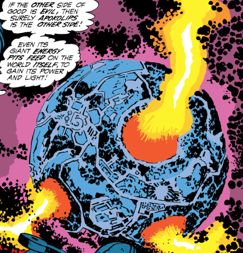 …moving with majestic serenity, in eternal partnership with the seething giant, Apokolips, a sunlit sister world.