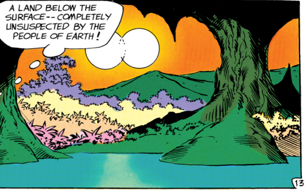 Always in the middle of the sky, the sun never sets in Skartaris. It’s bowl-shaped and, due to its unique properties, time is skewed. Skartaris is filled with magical energy, “queer and unknown animals” and… dinosaurs!