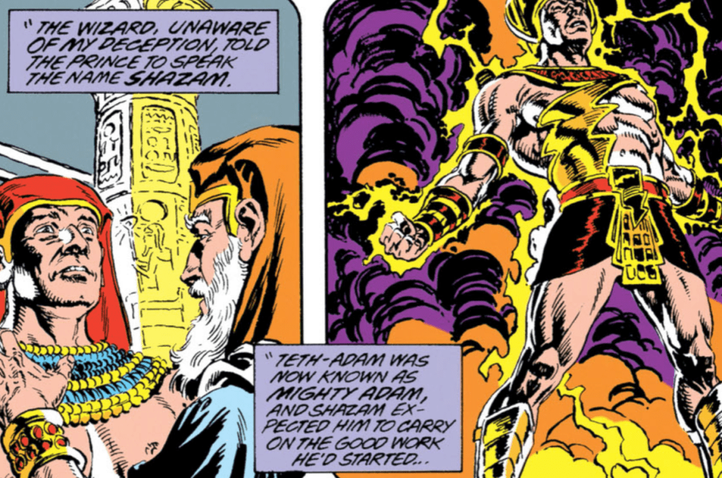 When he helped his nephew, Aman, escape, Adam was wounded and the two men were magically transported into the Rock of Eternity where they met the wizard Shazam.