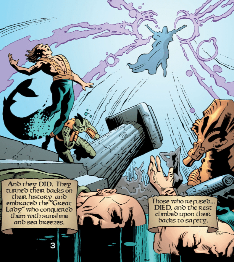 Atlanteans are wed to their history, so we consult the Chronicles of Atlantis, 1043 B.C., and learn of a golden age where “peace reigned for a thousand years. Where strangers were welcomed with open arms.”