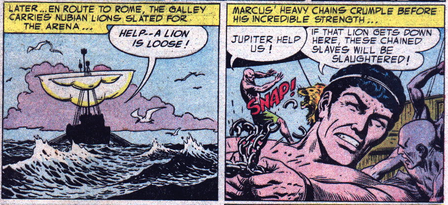 When he fends off the lions, Marcus’s captors realize he would bring a high price as a gladiator. Sold for 1,000 pieces of god, he becomes known as “Marcus, the Mighty.”