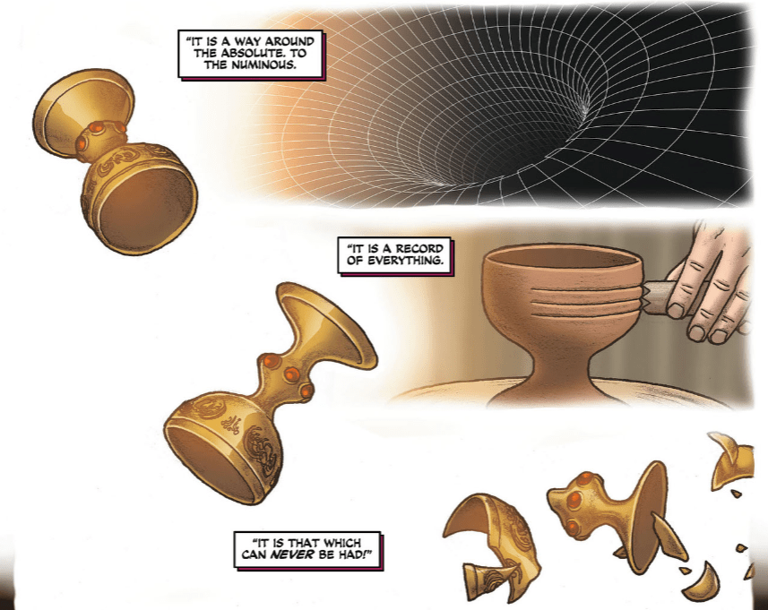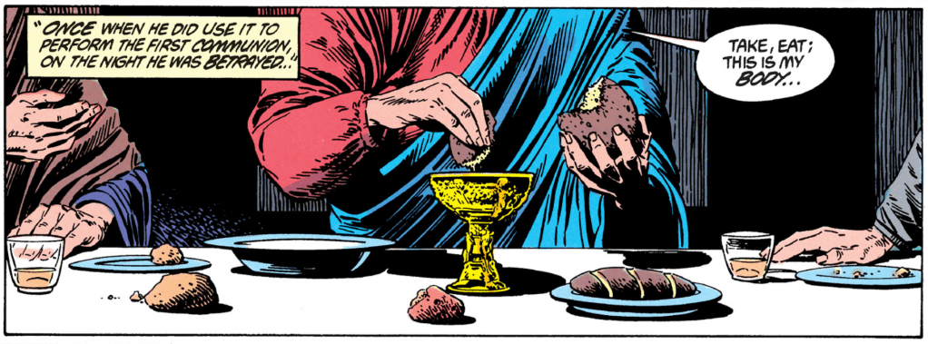 During the Last Supper before he was crucified, Jesus drank from the “Grail” over which Rheelai was murdered 33,000 years earlier. It was later used to collect his blood while he died on the cross. It was imbued with great power.
