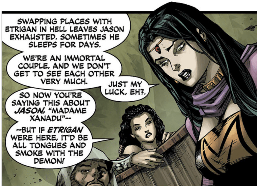 During her travels, she again met Jason, who now had Etrigan trapped inside him.