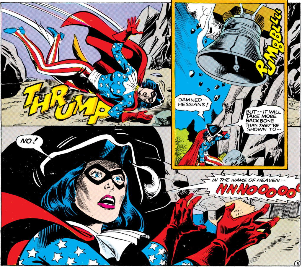 In 1776, Miss Liberty foiled the efforts of a squad of Hessians attempting to steal the Liberty Bell. An explosion of powder horns caused the bell to fall. It crashed upon Miss Liberty, crushing her to death.