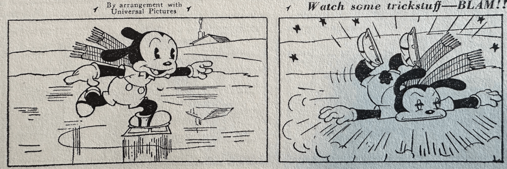 Scanning the list of comics in these issues, there aren’t many familiar names… except one: Oswald the Rabbit. Oswald was a cartoon character created by Walt Disney for Universal Pictures. He starred in several animated shorts in theaters from 1927-1938. However, Universal took control of the character in 1928, at which time Disney created… Mickey Mouse!