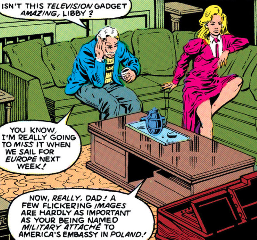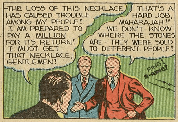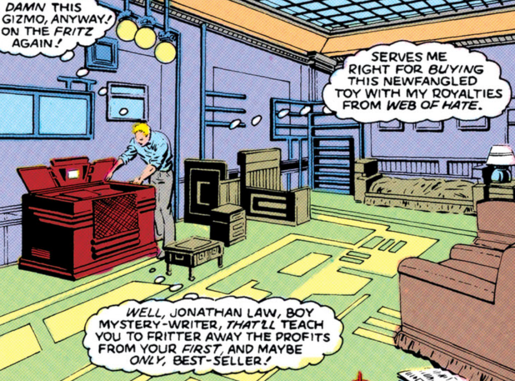 Wesley Dodds didn’t know at the time that Lee Travis was the Crimson Avenger. Together, they stopped a plot by “the Phantom of the Fair” to use a voice-controlled robot, Elektro, to attack the visiting King and Queen of England. (This was after Dodds thought “the Crimson” was working with the Phantom and the two crimefighters fought each other.)