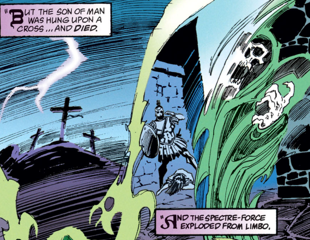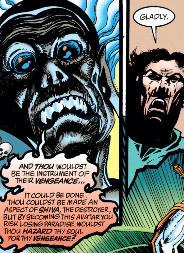 The first true “Spectre” was a man from India named Chakara. When he and his family were slain by a witch (Lady Beltrane), Michael appeared to him as the goddess Kali and offered him a chance for vengeance. His soul merged with the Wrath of God and he became a killing ghost that sought justice.