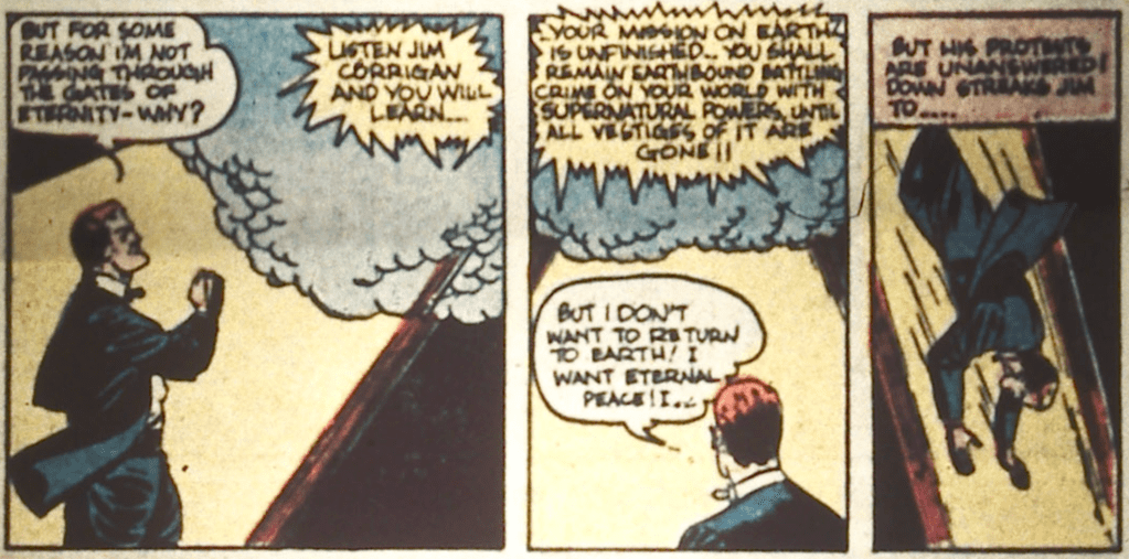 However, the two were abducted by criminal “Gat” Benson, and Corrigan was sealed in a barrel filled with cement and dropped into the river. His spirit rose filled with anger and he was greeted with a mysterious voice that offered him a chance to seek vengeance.