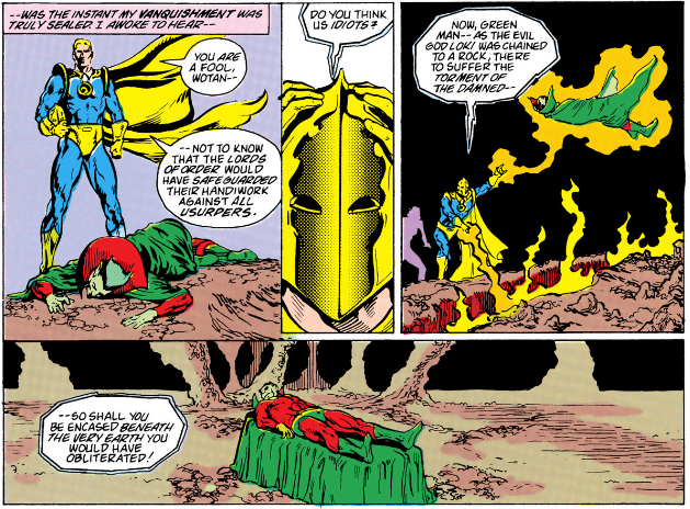 There, he found a doorless, windowless tower that Wotan had built in the desert. Inside, Nabu’s enemy held captive a young college student named Inza Cramer. During battle, Wotan rendered Dr. Fate unconscious…
